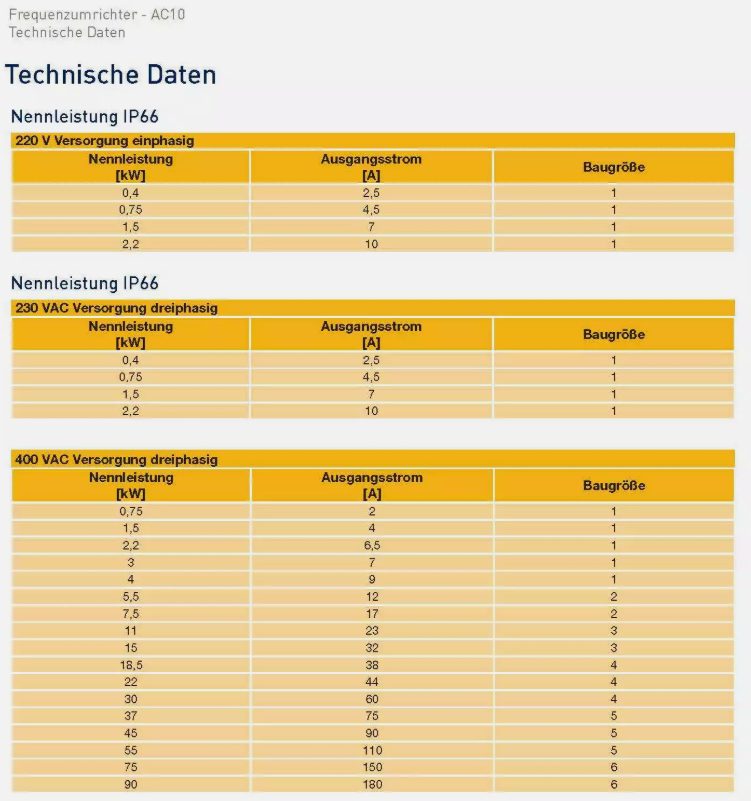 AC10 IP66 bietet eine pragmatische Lösung für den Betrieb von Motoren in Industrieanwendungen in vielen Branchen. Das IP 66 Gehäuse kann sowohl für Anwendungen im Innenbereich aber auch im Außenbereich, wo raue Bedingungen herrschen, wie z.B. an Waschplätzen in Lebensmittel- und Getränkebetrieben oder auf Abfallverwertungsanlagen oder Dachaufbauten, eingesetzt werden. Bei Anwendungen im Freien sollte der Antrieb unter einem geeigneten Schutz montiert sein um ihn gegen mögliche Schäden, verursacht durch Sonne, Eis oder Schnee, zu schützen. Frequenzumrichter - AC10 Funktionsmerkmale Für alle Umgebungsbedingungen geeignet • Robustes Gehäuse, IP66 Schutzklasse zum Schutz vor Umwelteinflüssen • Optionale interne EMV Filter für den Einsatz in Industrieumgebungen der Klasse 3 • Beschichtung nach Klasse 3C3 bietet Schutz in anspruchsvollen Umgebungen • 50 °C Betriebstemperatur Flexible Anschlüsse • Je nach Anwendung frei belegbare digitale Ein- und Ausgänge sowie Relaisausgang • Integrierter dynamischer Bremsschalter Standard • Verbindung zu SPS oder anderen Modbus RTU / RS485 Netzwerken Zusätzliche Leistung • 150 % Überlast für 0,5 Hz bietet zusätzliches für hohe Trägheitslasten • Die Ausgangsleistung niedrigen Umgebungstemperaturen erhöht werden Einfacher Zugriff auf den Anschluss • Einfacher Zugriff auf Verbindungen mit abnehmbarer Durchführungsplatte IP66 / NEMA 4x ist konform zu IEC Standard